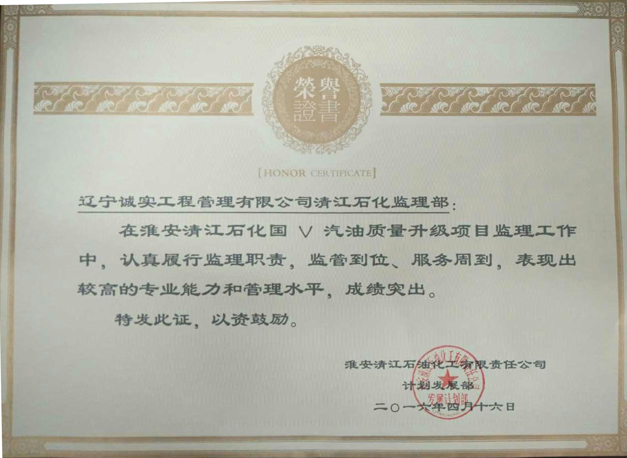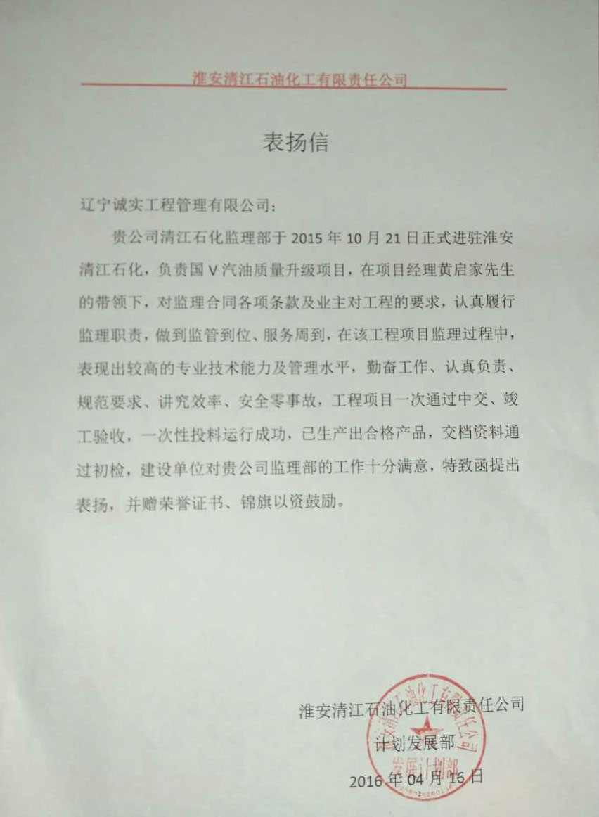 我公司監(jiān)理人員在“中石化淮安清江石油化工有限責(zé)任公司國(guó)Ⅴ汽油質(zhì)量升級(jí)項(xiàng)目”工程監(jiān)理服務(wù)工作中,得到了建設(shè)單位的一致認(rèn)可和肯定,對(duì)我們的工作表示十分滿意,特發(fā)函提出表?yè)P(yáng),并贈(zèng)與榮譽(yù)證書、錦旗以資鼓勵(lì)。