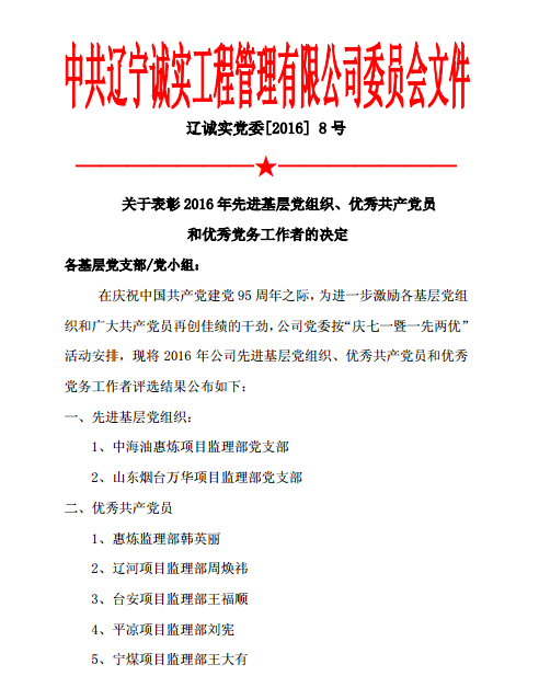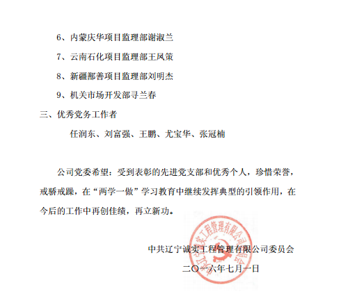 7月1日下午,公司黨委召開《慶祝建黨95周年暨“一優(yōu)兩先”表彰視頻大會(huì)》。主會(huì)場(chǎng)設(shè)在公司一樓會(huì)議室,中海油惠州項(xiàng)目監(jiān)理部黨支部、甘肅華亭項(xiàng)目監(jiān)理部黨支部、神華寧煤項(xiàng)目監(jiān)理部黨支部、煙臺(tái)萬華項(xiàng)目監(jiān)理部黨支部設(shè)立視頻分會(huì)場(chǎng)。黨委副書記馮玉琢主持了視頻大會(huì)。首先為新黨員中海油惠州項(xiàng)目監(jiān)理部黨支部的李婷婷舉行了入黨宣誓儀式,公司黨委委員劉興善同志宣讀了公司黨委對(duì)戰(zhàn)勝、吳琪轉(zhuǎn)為中共正式黨員的批復(fù)。公司黨委委員馬俊同志宣讀了“一優(yōu)兩先”表彰決定。黨委書記孫學(xué)良結(jié)合公司實(shí)際做了慶祝建黨95周年的講話。最后全體黨員重溫的入黨誓詞,進(jìn)行入黨宣誓。