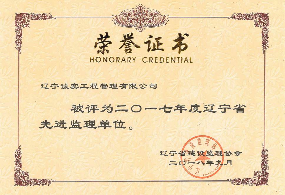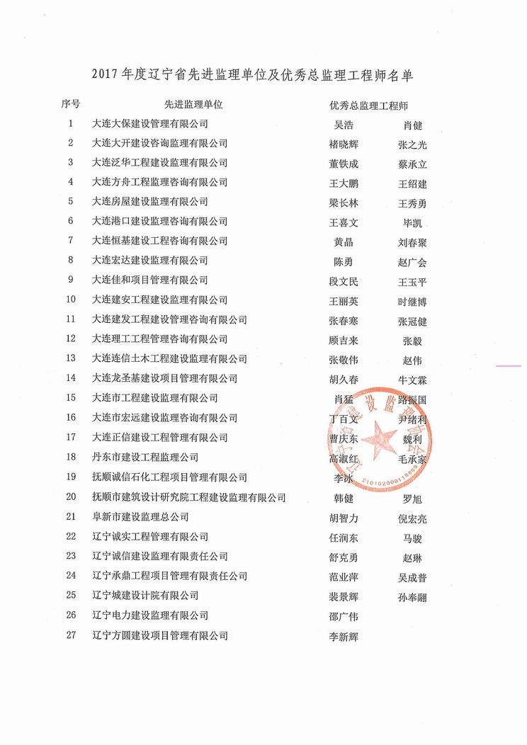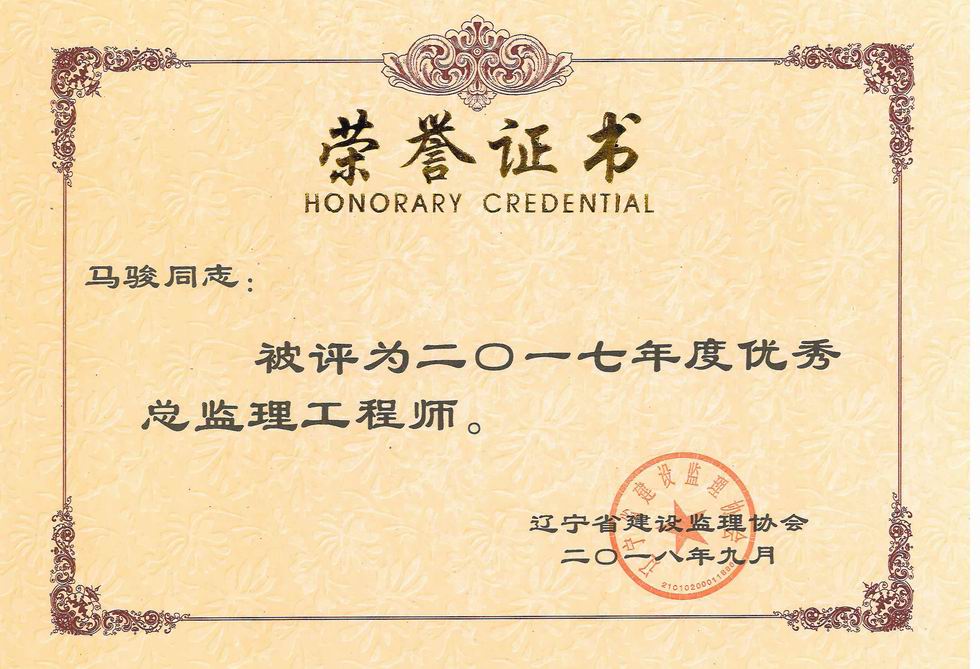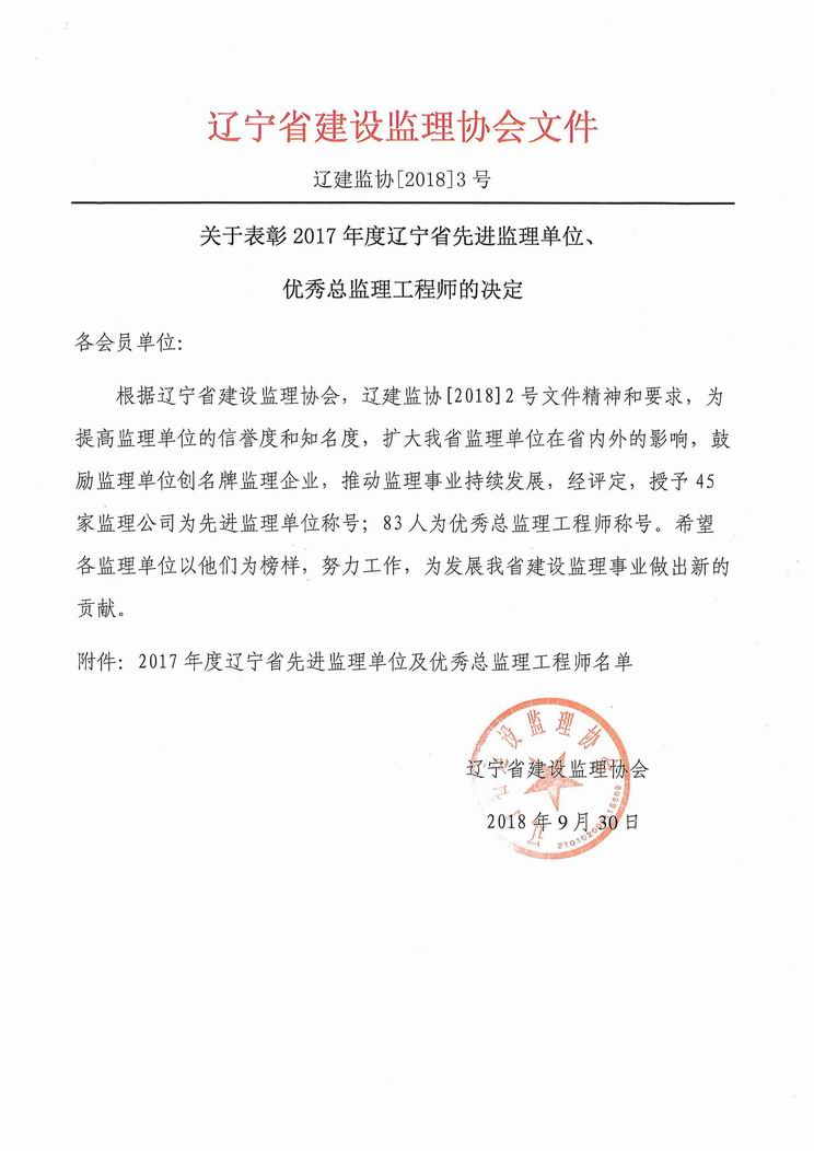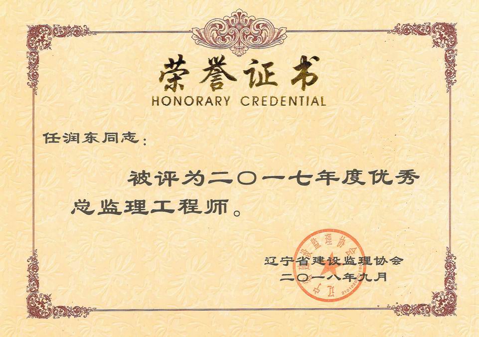我公司被遼寧省建設(shè)監(jiān)理協(xié)會(huì)評(píng)為2017年度遼寧省先進(jìn)監(jiān)理單位、任潤(rùn)東和馬駿被評(píng)為優(yōu)秀總監(jiān)理工程師