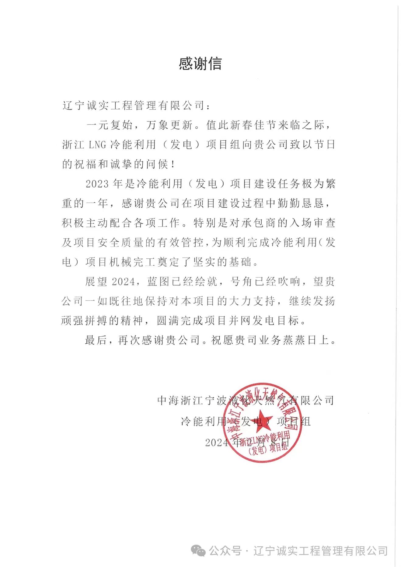 浙江LNG冷能利用(發(fā)電)項目組向公司發(fā)來了感謝信,信中肯定了公司項目部人員在2023年的努力,特別是對于承包商入場審查及項目安全質(zhì)量的有效管控,為項目機械完工奠定了堅實的基礎(chǔ)。該項目是積極響應(yīng)國家及浙江省“十四五”規(guī)劃的節(jié)能減排政策,落實“綠色低碳”發(fā)展戰(zhàn)略的示范項目,項目投產(chǎn)后,預(yù)計年凈發(fā)電量約為2408萬度,節(jié)省標(biāo)準(zhǔn)煤超3000tce,年減少CO₂排放可達(dá)18000多噸。展望2024年,項目部在黃思敏總監(jiān)的帶領(lǐng)下,將認(rèn)真執(zhí)行監(jiān)理職責(zé),積極推進(jìn)項目建設(shè),爭取項目早日建成投產(chǎn)。