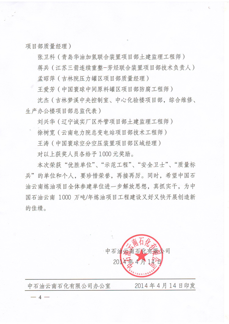 我公司榮獲中國(guó)石油云南1000萬噸/年煉油項(xiàng)目2014年3月份“優(yōu)勝單位”榮譽(yù)稱號(hào)!